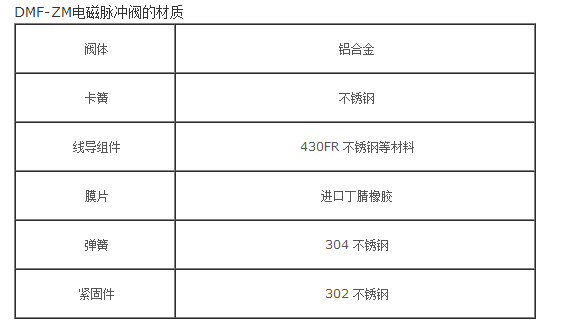 ZM型電磁脈沖閥的閥體,閥蓋采用鋁合金壓鑄制成,經表面處理后,具有良好的防腐蝕性能。膜片及密封墊采用新工藝硫化和復合。電磁先導頭選用高效磁性材料和不銹鋼隔磁材料組成,彈簧和緊固件均采用不銹鋼材料。分氣箱(氣包)的接管和除塵器的噴吹管分別插入閥的進出口。并擰緊二端壓緊螺母密封。