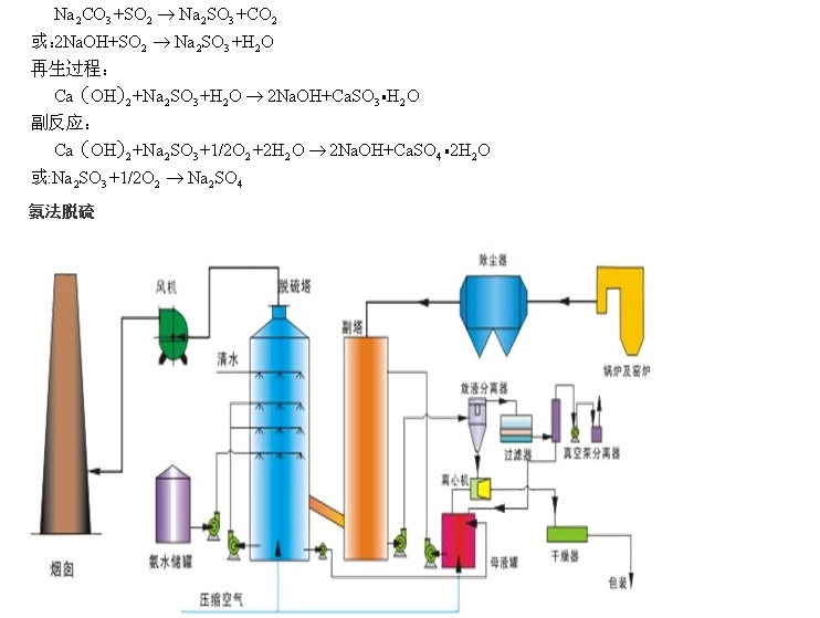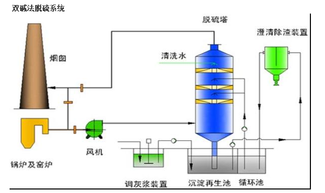 為了克服石灰/石灰石法容易結垢和堵塞的缺點,發(fā)展了雙堿法。該法先用可溶性的堿性清液作為吸收劑吸收,然后再用石灰乳或石灰對吸收液進行再生。反應如下:脫硫過程